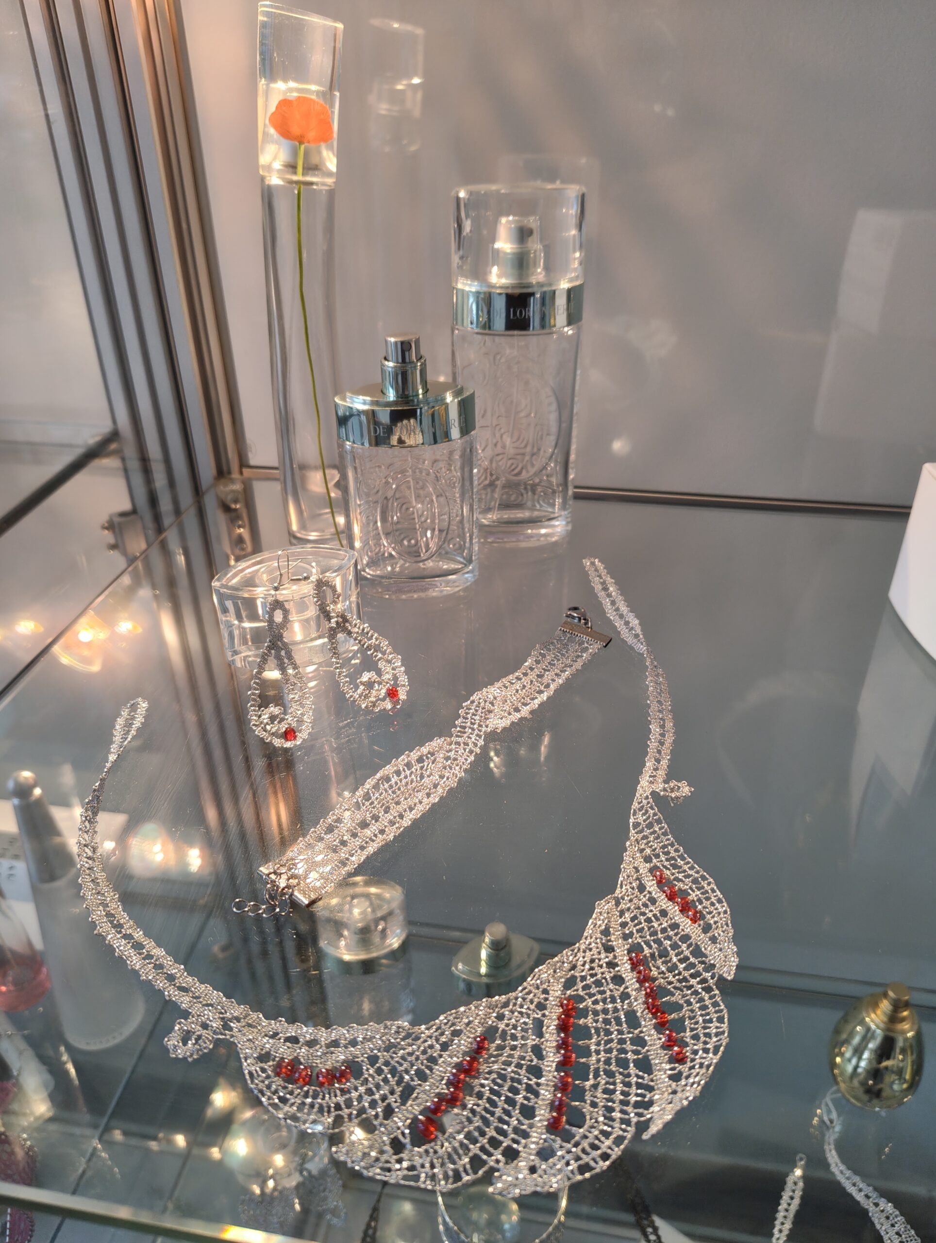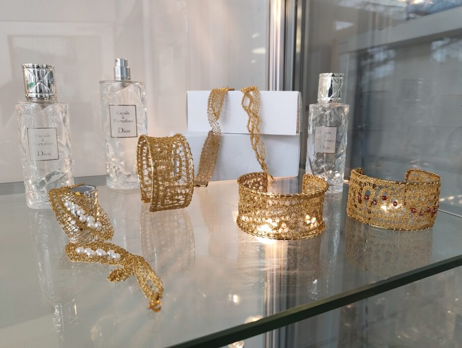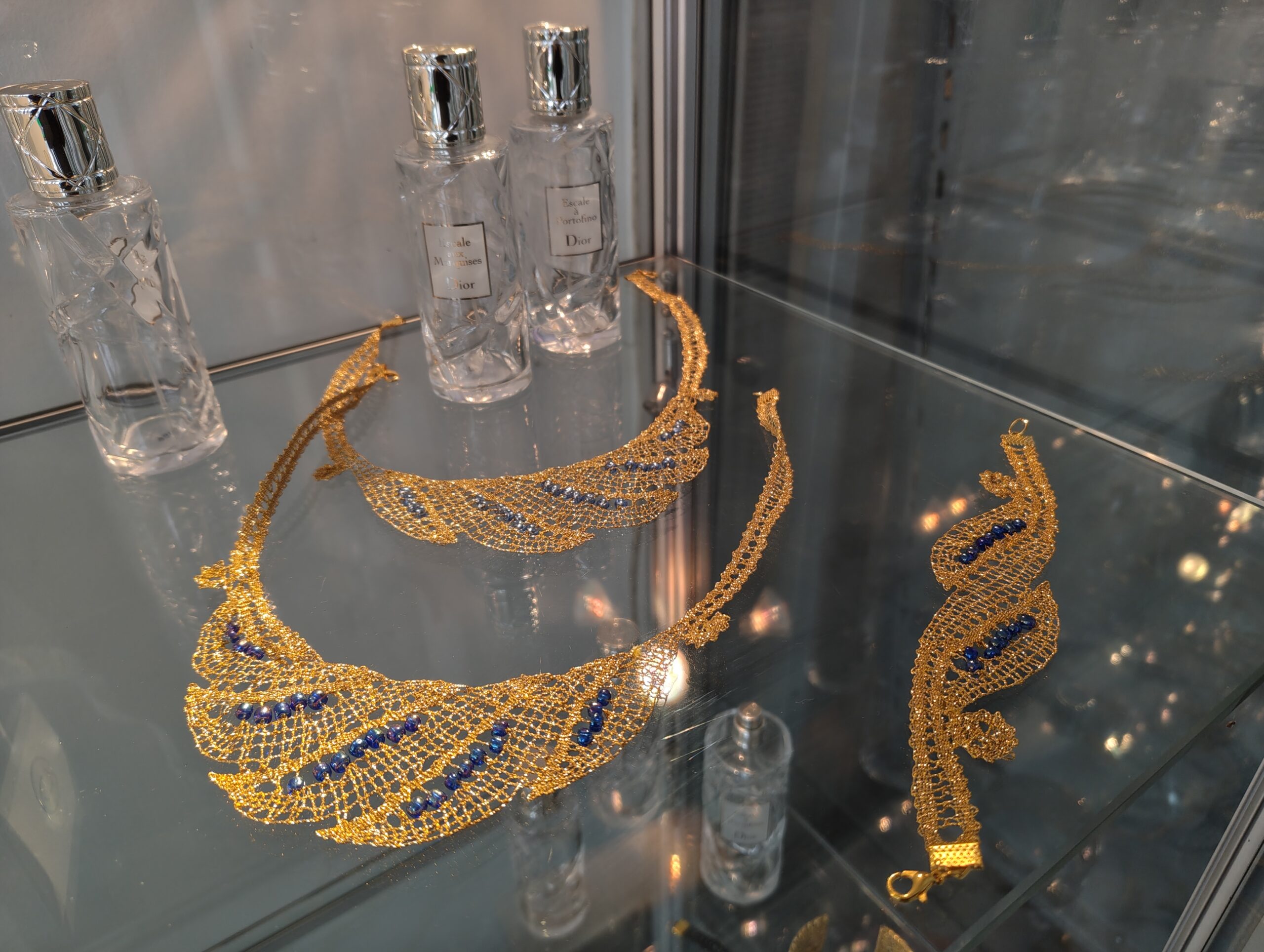 Razstava klekljanega nakita v vitrinah sežanske knjižnice